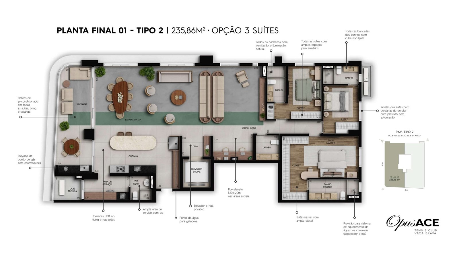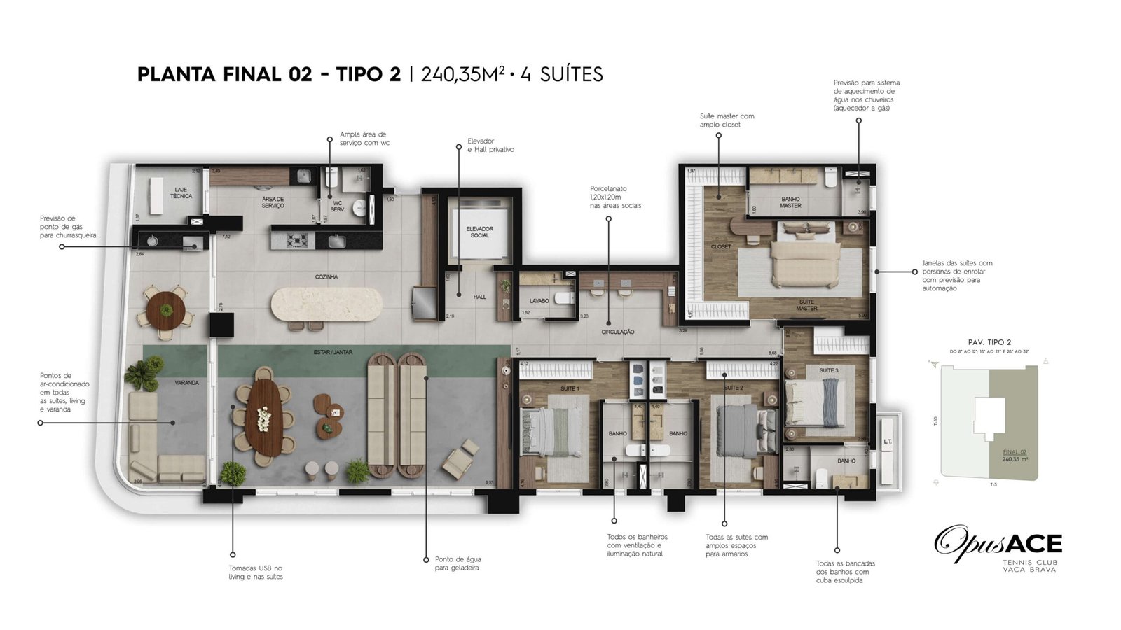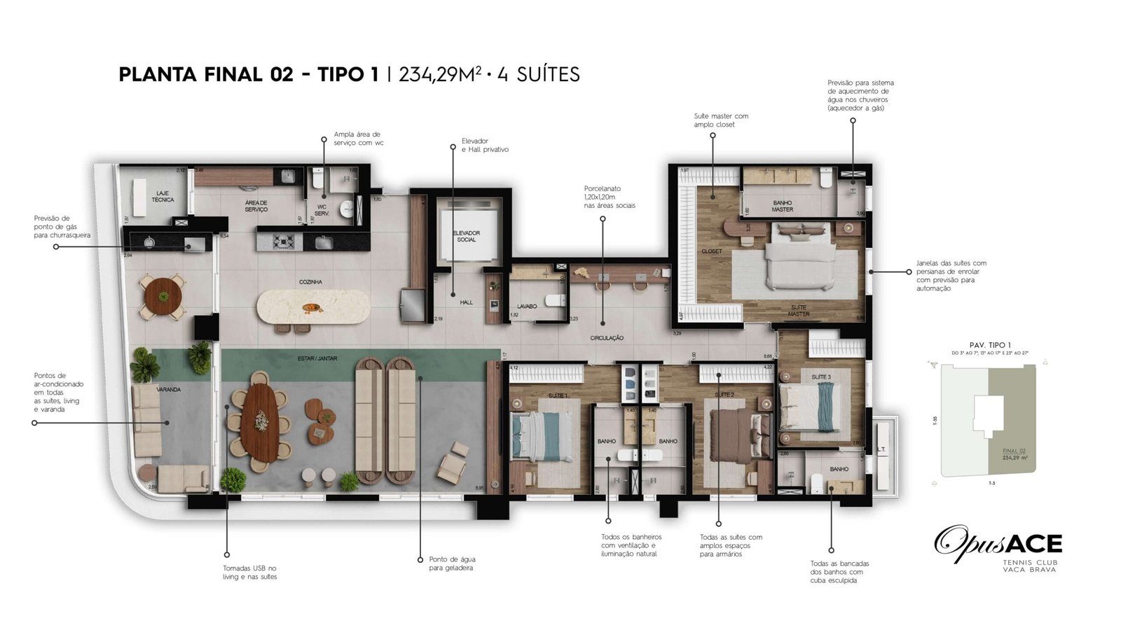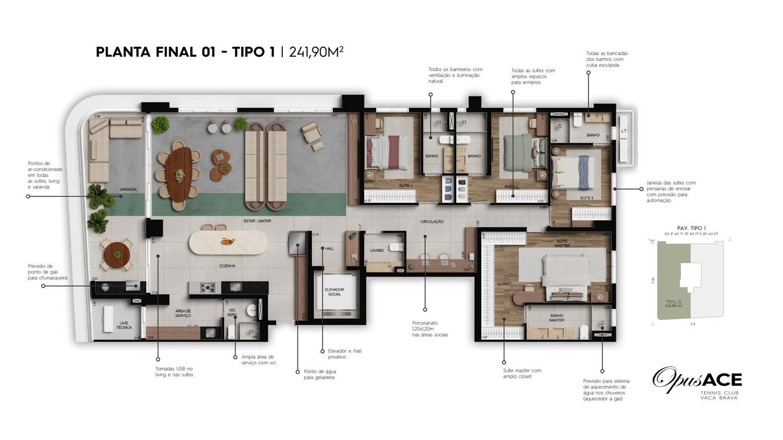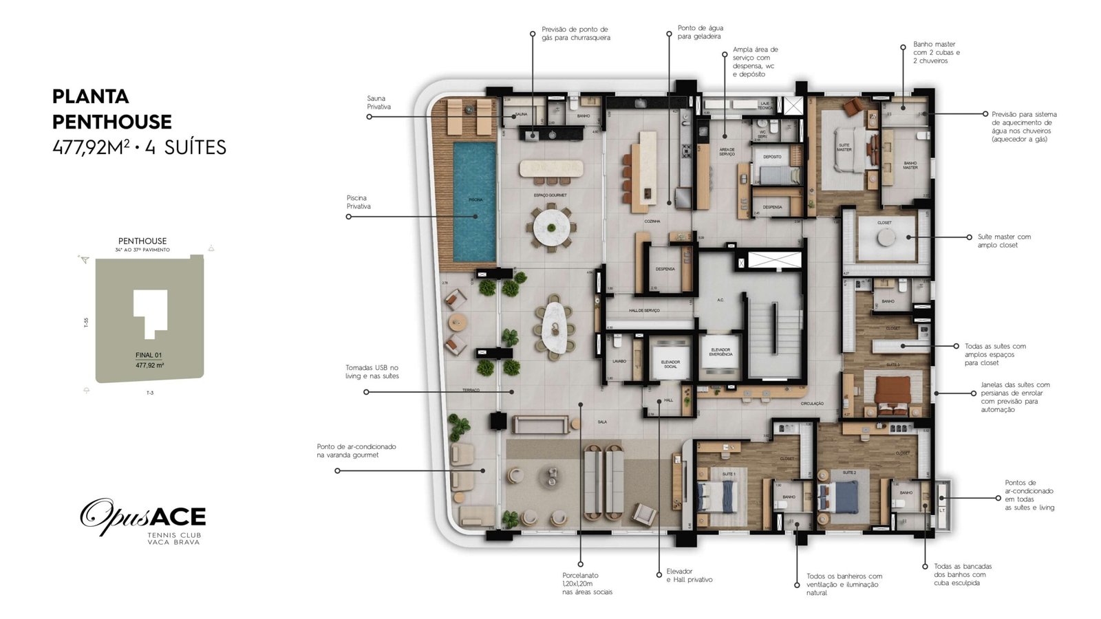 Além de todas as comodidades de cada condomínio, os moradores das torres da Opus terão acesso a esse espaço com quadra de tênis de padrão profissional, academia com pilates e spinning, spa, piscinas aquecidas, entre outros.